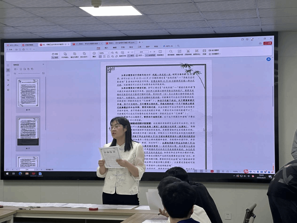 宣讲会上,学工办副主任马春艳围绕国家助学贷款政策要点、展期办理流程细节、贷后管理具体规范以及毕业确认所需材料等内容展开深入讲解。着重强调,同学们务必筑牢诚信意识,清晰认识个人征信对未来生活、金融活动的深远影响,严格遵守贷款合约和还款协议,按时、足额偿还国家助学贷款,避免因逾期还款给自己带来信用受损等不良后果。