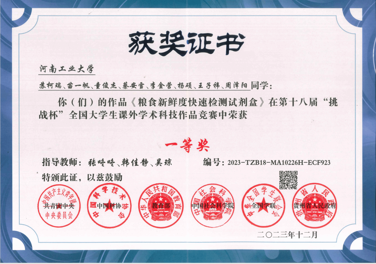 第十八届“挑战杯”全国大学生课外学术科技作品竞赛一等奖
