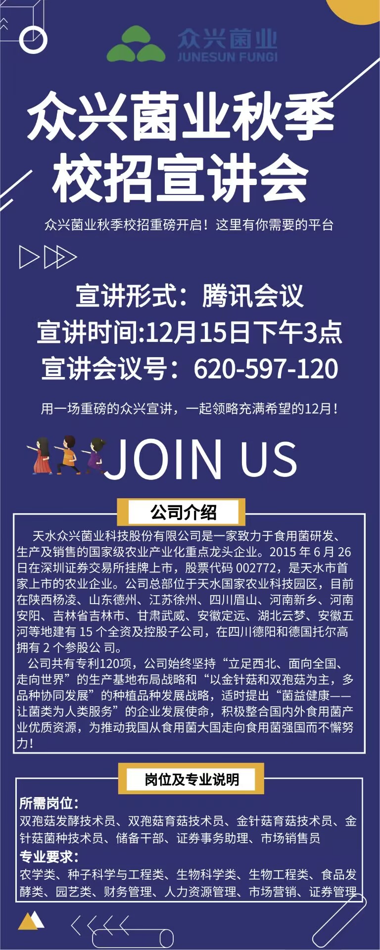 双孢菇发酵技术员、双孢菇育菇技术员、金针菇育菇技术员、金针菇菌种技术员、储备干部、证券事务助理、市场销售员