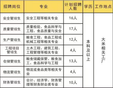 谷粒“计划:大米管理部“谷粒”管培生人才培养计划是为中粮集团旗下主粮业务核心板块中粮粮谷控股有限公司大米业务培养管理储备干部和专业技术精英的人才培养计划,旨在发现、选拔、塑造未来的团队领袖和资深专家。我们自诩为伯乐,真诚寻访千里马。该计划由中粮粮谷大米管理部统筹为生产、储运、质量、安全等专业领域的各位“新谷粒"管培生配备2位专业名师及2位生活导师,在2年时间里通过基地集中培训、工厂一线实践、不同部门轮岗、专业项目锻炼、总部以干代训等多方式全方位培养。现谷粒一期的77名管培生们已在中粮各大米厂初绽锋芒。谷粒二期管培生校招即将开始,虚位以待。为国谋粮为民谋福,机遇临门,等你“稻”来