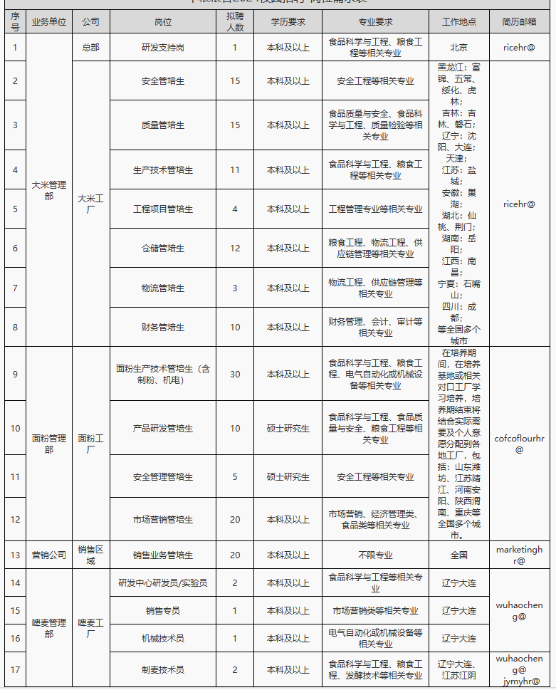 主要需求专业包括:食品科学与工程类、粮食工程类、机械及机电类、仓储物流类、财会类、市场营销类等多个专业方向。