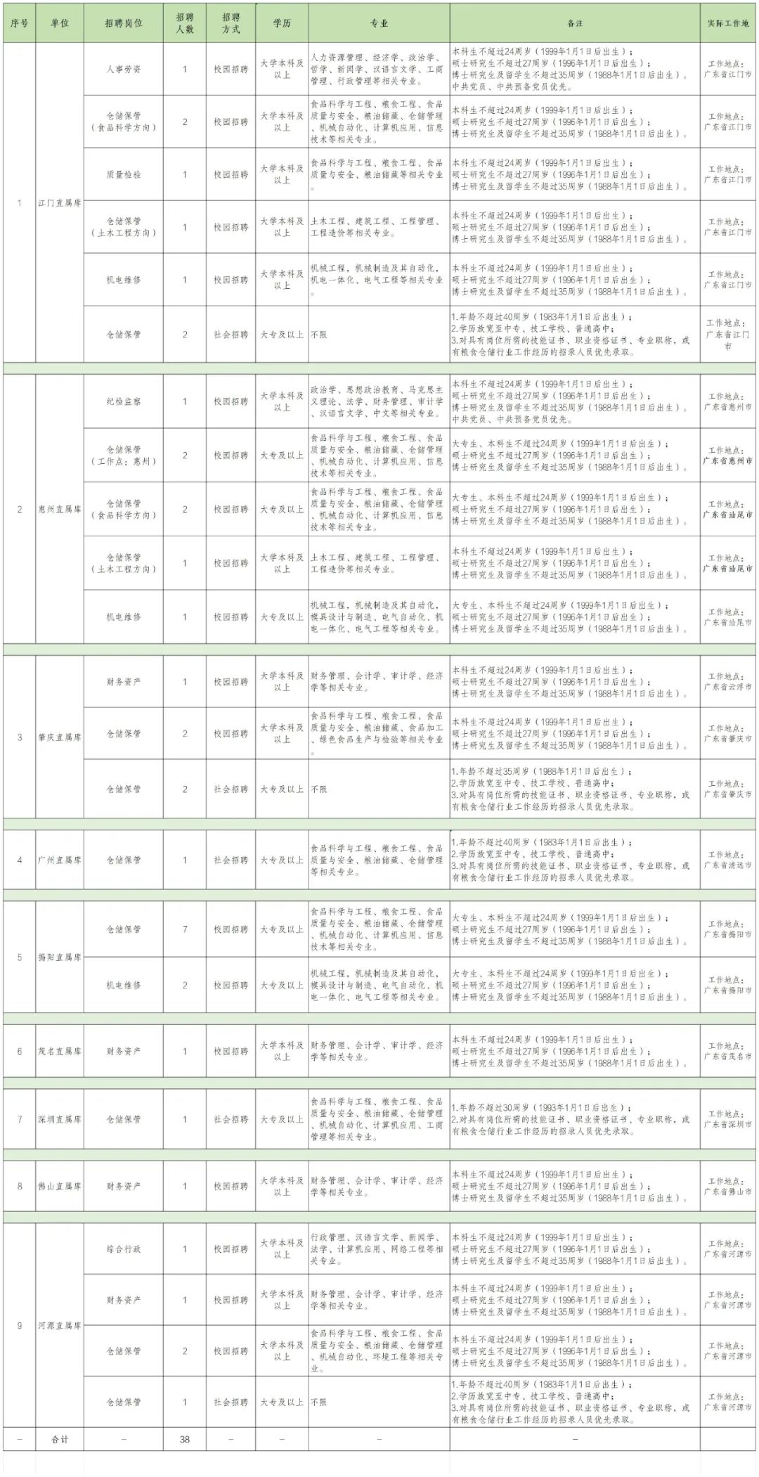 本次招聘为中储粮集团广东分公司辖区直属企业岗位,包括仓储保管、质量检验、财务资产、综合行政、纪检监察、人事劳资、机电维修等岗位。