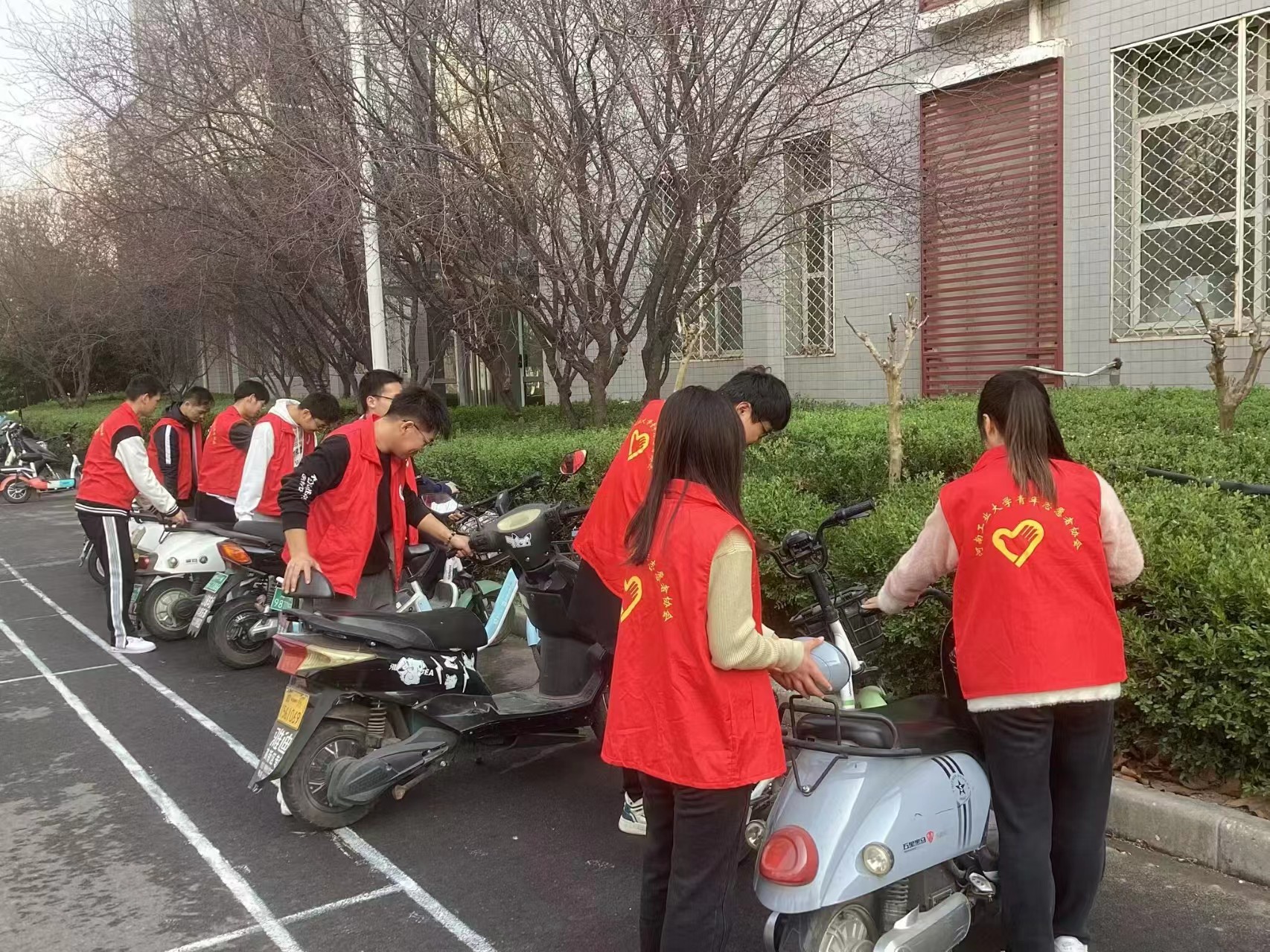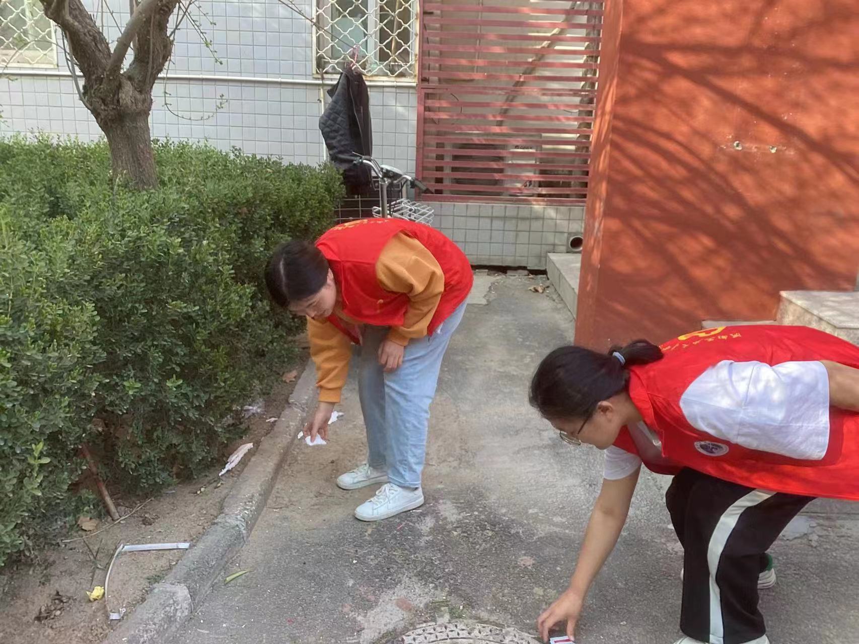 楼内外及周边的垃圾,整理了无序停放的电动车辆,铲除了教学楼外张贴的小广告,并号召路过的同学一起加入到美化校园环境的队伍中来。活动中,大家热情高涨,一丝不苟的打扫每一个角落,原本杂乱的车辆区域变得井然有序,校园环境也变得更加整洁明亮,进一步传播了“服务人民、助人为乐”的雷锋精神。