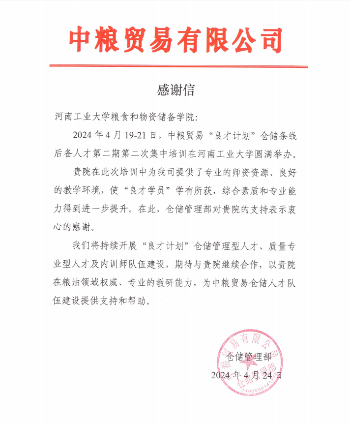信中提到,2024年4月19日至21日,中粮贸易“良才计划”仓储后备人才第二期第二次集中培训在888娱乐城