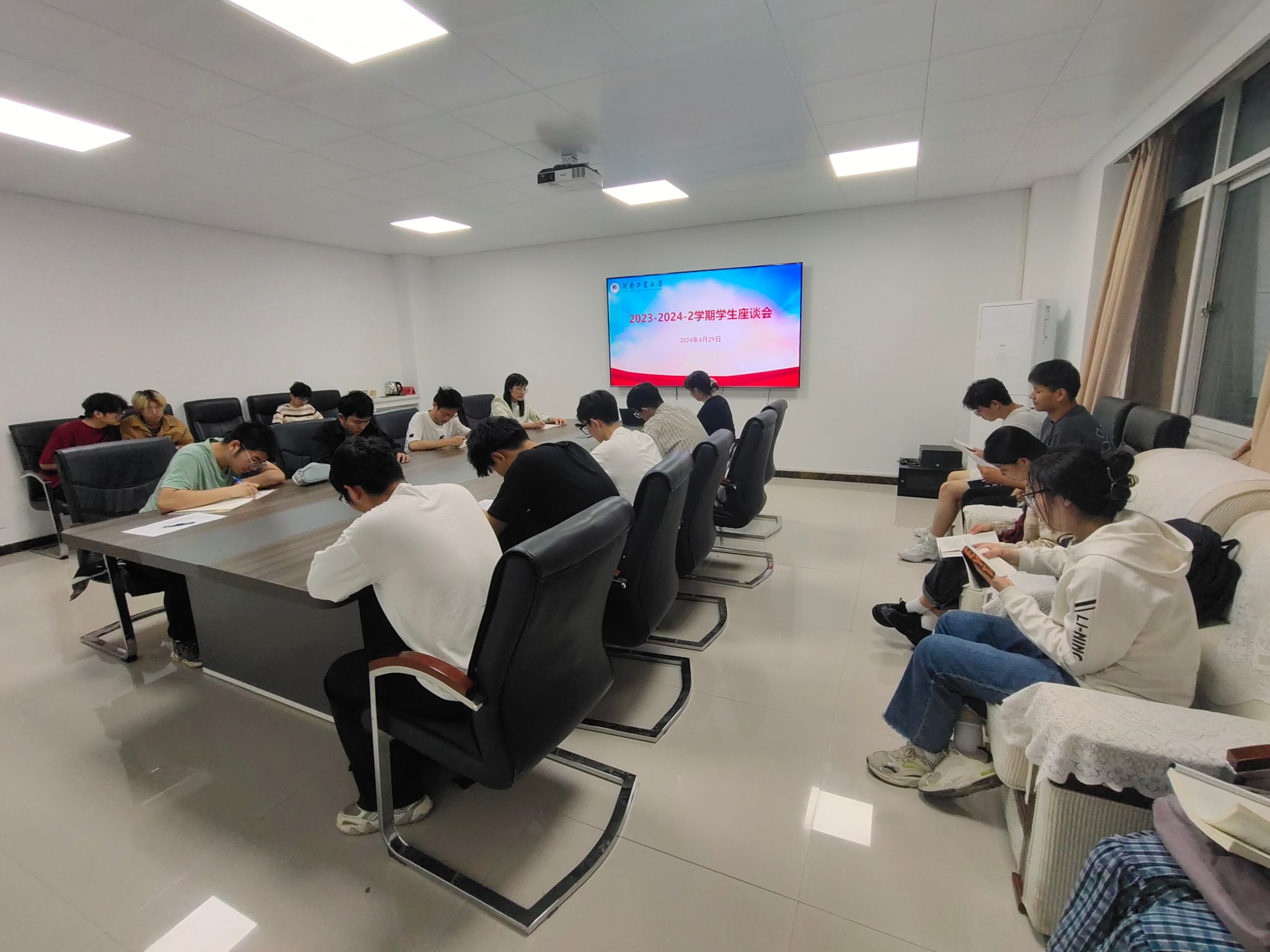 在40212会议室召开期中教学工作学生座谈会。会议由教学办主任耿俊杰主持,学工办副主任马春艳及学生代表参加会议。