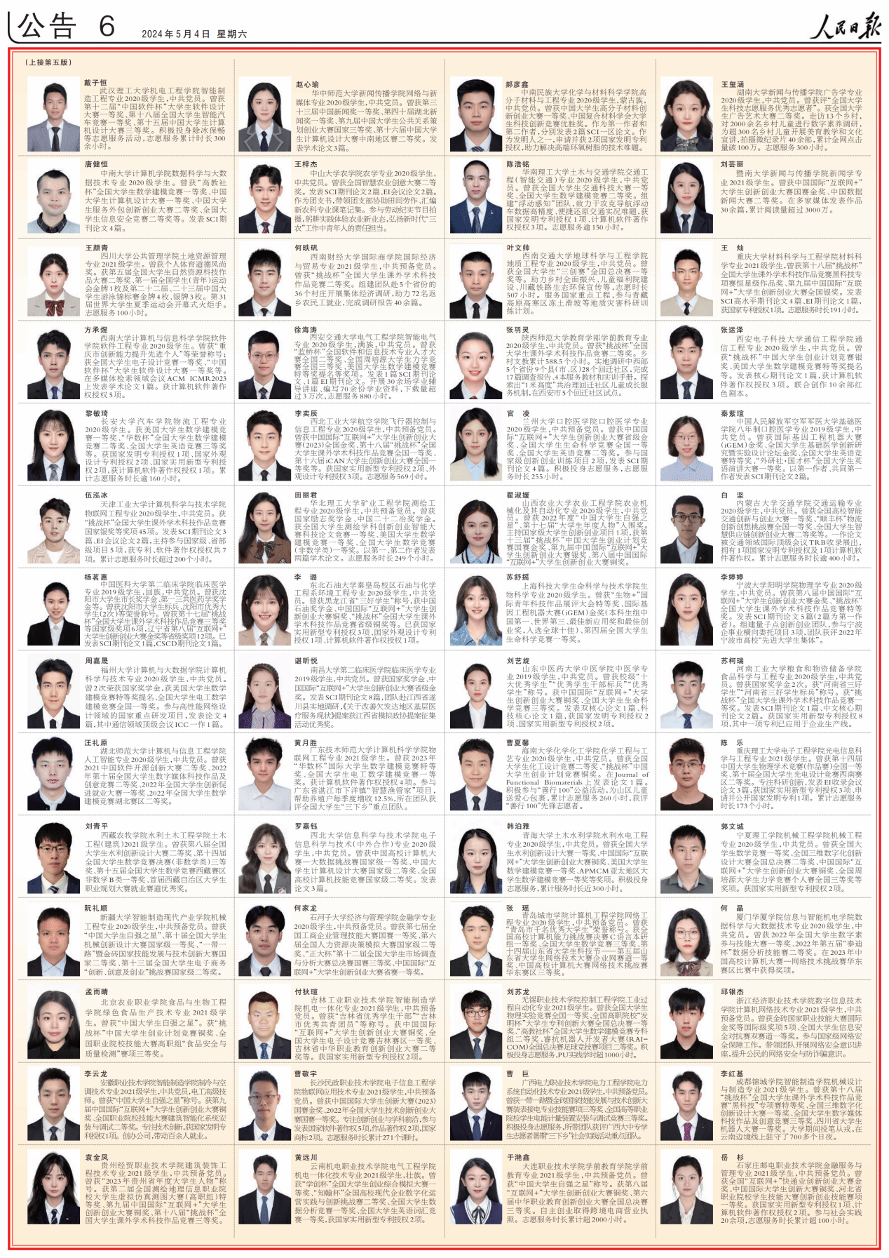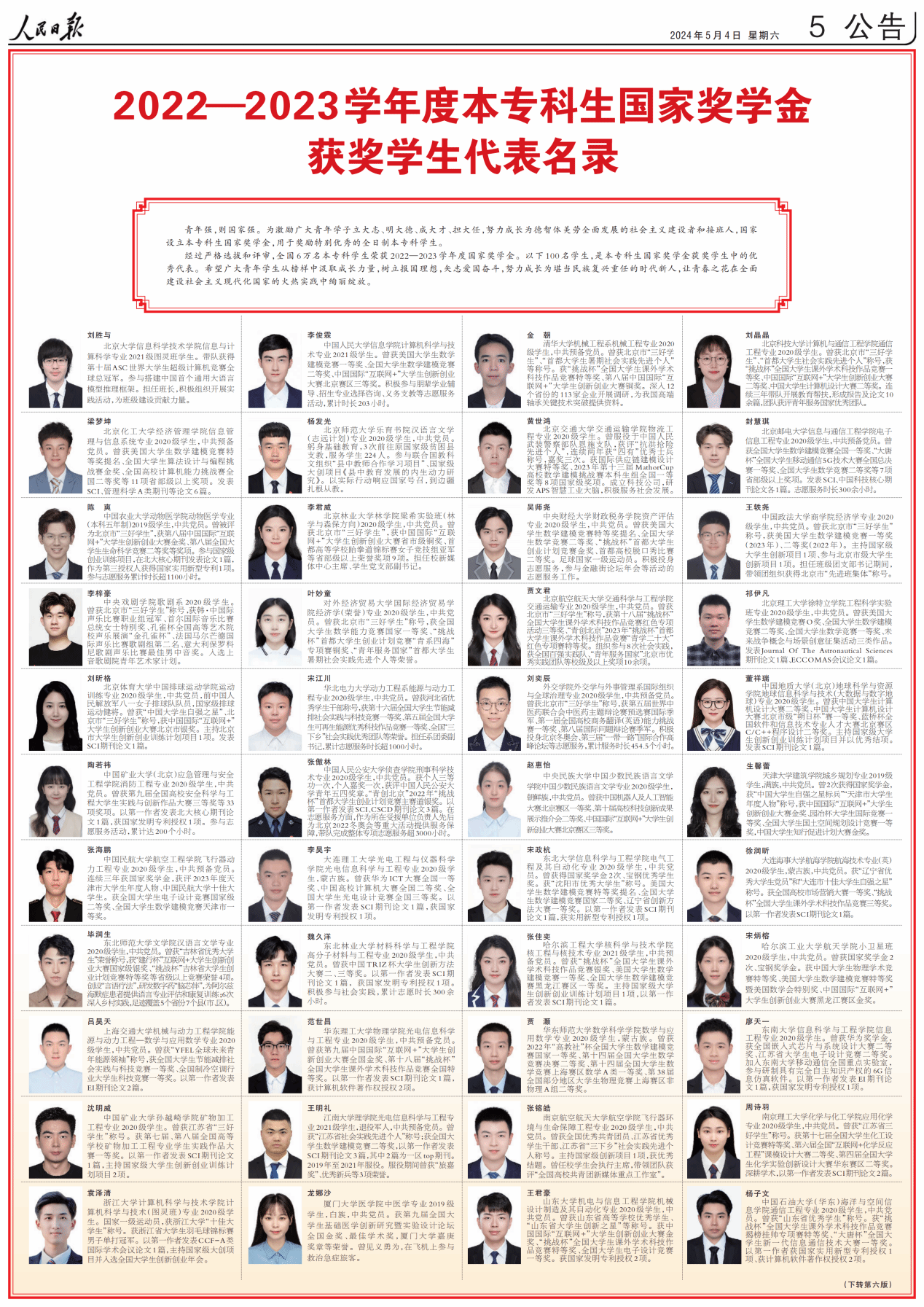 青年强,则国家强。为激励广大青年学子立大志、明大德、成大才、担大任,努力成长为德智体美劳全面发展的社会主义建设者和接班人,国家设立本专科生国家奖学金,用于奖励特别优秀的全日制本专科学生。经过严格选拔和评审,全国6万名本专科学生荣获2022-2023学年度国家奖学金。此次《人民日报》整版刊登的100名学生,是本专科生国家奖学金获奖学生中的优秀代表。