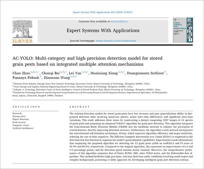 储藏物害虫防治团队在储粮害虫智能检测技术领域取得了最新研究成果。该成果发表在人工智能领域国际顶级期刊Expert Systems With Applications(近三年平均影响因子8.2,中科院SCI一区Top,大类学科:计算机科学),888娱乐城