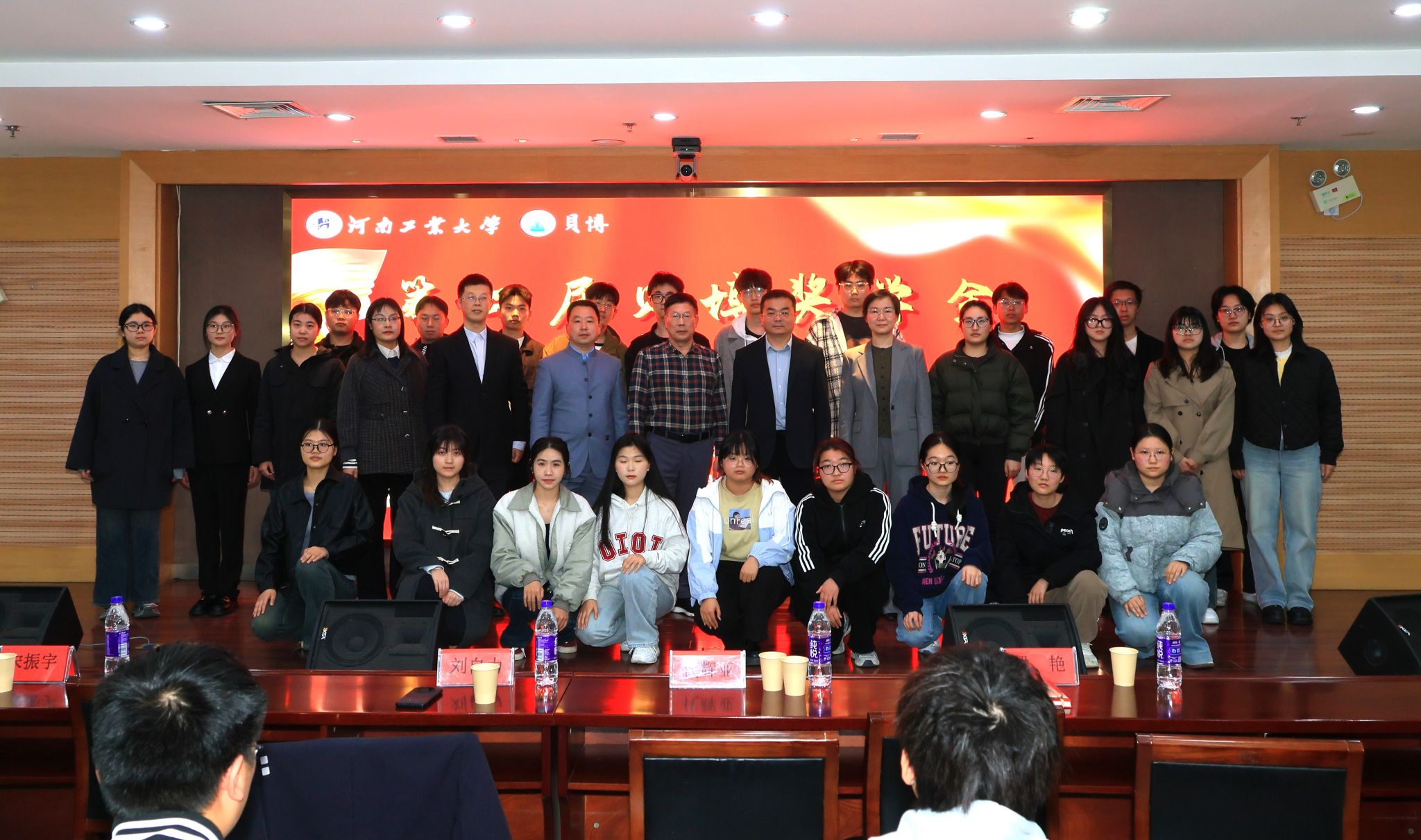 第二届贝博奖学金颁奖典礼在行政楼D102报告厅隆重举行,郑州贝博电子股份有限公司(以下简称贝博公司)总经理刘自力、销售总监宋振宇、宣传设计张芊芊,888娱乐城